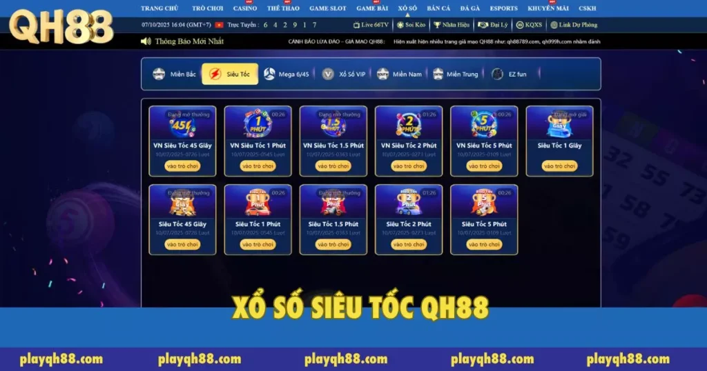 - Trò chơi xổ số siêu tốc QH88 hoạt động theo mô hình mỗi phút 1 kỳ, giúp bạn tham gia nhanh nhiều phiên trong ngày.